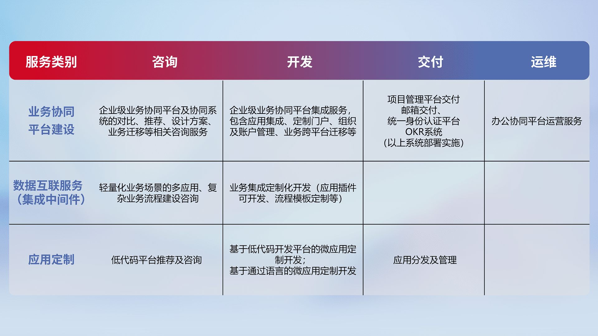 针对钉钉、、企微、、、、IDaas等平台级产品提供产品的规划、、、、方案、、、、交付、、、、定制化开发等服务,,,实现如统一协同办公、、、智能客户服务、、、混合会议管理、、、智能数据查询、、、等业务场景,,实现数字化转型。。